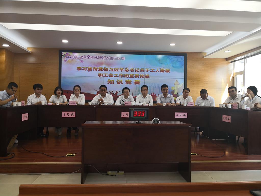為積極響應(yīng)省公航旅集團(tuán)公司《關(guān)于開展學(xué)習(xí)宣傳貫徹習(xí)近平總書記關(guān)于工人階級(jí)和工會(huì)工作的重要論述知識(shí)競(jìng)賽的通知》精神,進(jìn)一步深入宣傳貫徹黨的十九大和工會(huì)十七大精神,深刻領(lǐng)會(huì)習(xí)近平總書記關(guān)于工人階級(jí)和工會(huì)工作的重要論述及“不忘初心、牢記使命”主題教育的學(xué)習(xí)內(nèi)容,完成中國工會(huì)十七大目標(biāo)任務(wù),緊緊圍繞“忠誠黨的事業(yè)、竭誠服務(wù)職工、引導(dǎo)職工群眾聽黨話、跟黨走”主題,激勵(lì)公司廣大職工,以昂揚(yáng)的精神狀態(tài),投身公司項(xiàng)目建設(shè)事業(yè),為集團(tuán)公司高質(zhì)量發(fā)展、建設(shè)幸福美好新甘肅貢獻(xiàn)力量,2019年7月10日,路投公司舉辦了“學(xué)習(xí)宣傳貫徹習(xí)近平總書記關(guān)于工人階級(jí)和工會(huì)工作的重要論述”知識(shí)競(jìng)賽活動(dòng)。